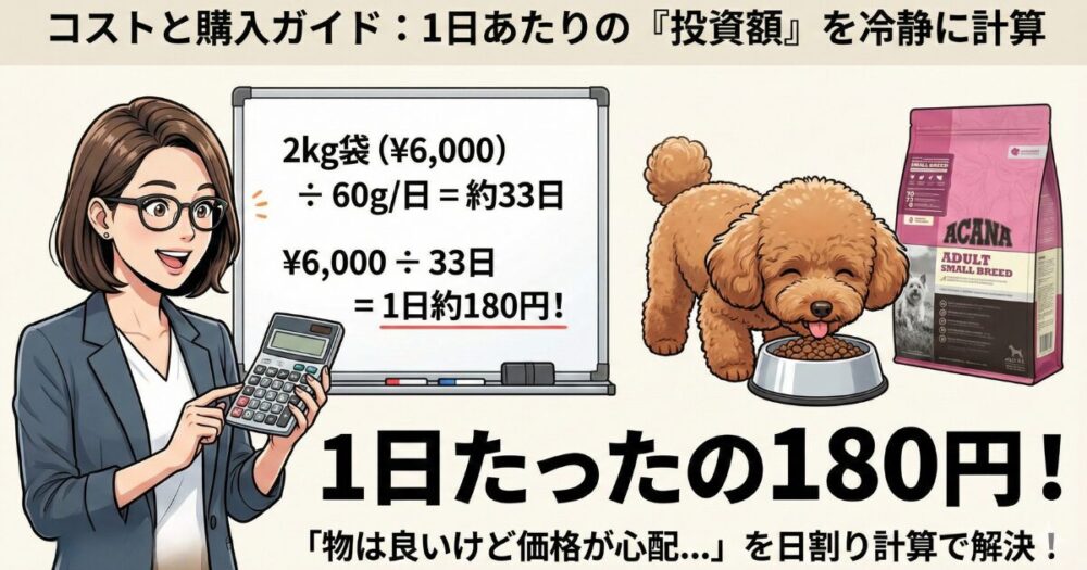 「アカナ アダルトスモールブリード」2kg入り(約6,000円前後と仮定)を購入した場合: